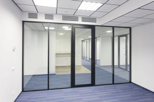 Противопожарные перегородки в коридор могут изготавливаться как в полностью остекленном варианте, так и в частично остекленном исполнении. Основное предназначение таких конструкций — это разделение общего помещения на несколько отдельных рабочих зон. При этом преследуется несколько целей: